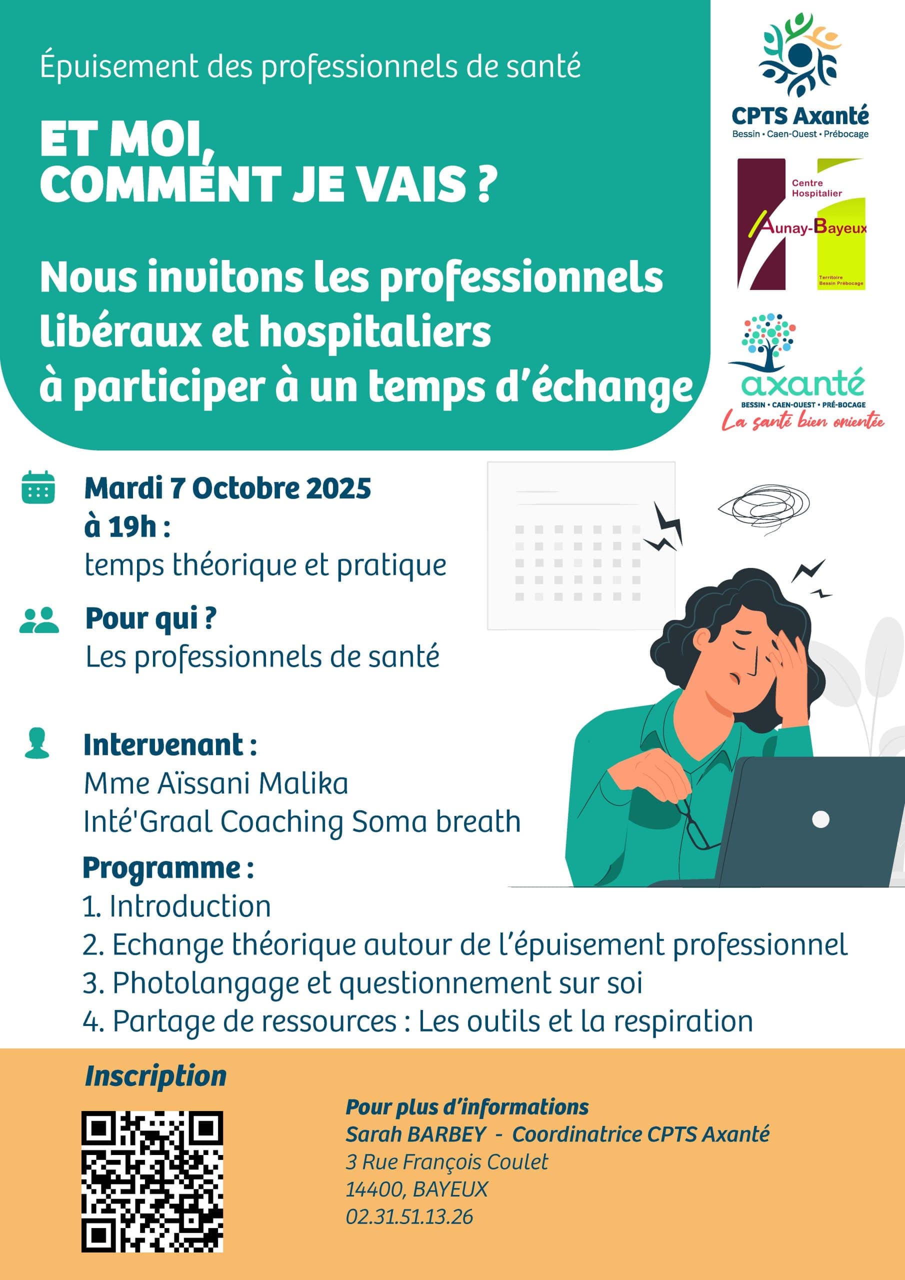 La CPTS Axanté organise un atelier sur l’épuisement professionnel à destination de tous les professionnels de santé le 7 octobre prochain à 19h dans les locaux de la CPTS Axanté (3 rue François Coulet 14400 Bayeux).